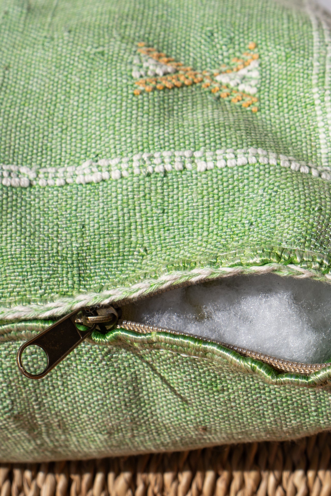 This beautiful handmade moroccan pillow in pastel green is crafted from the natural fibers of the Sabra cactus. Harvested, woven, and embroidered by local artisans. These traditional methods, passed down through generations. The different Berber motifs reflect Morocco's rich cultural heritage. Get the Boho Vibe!